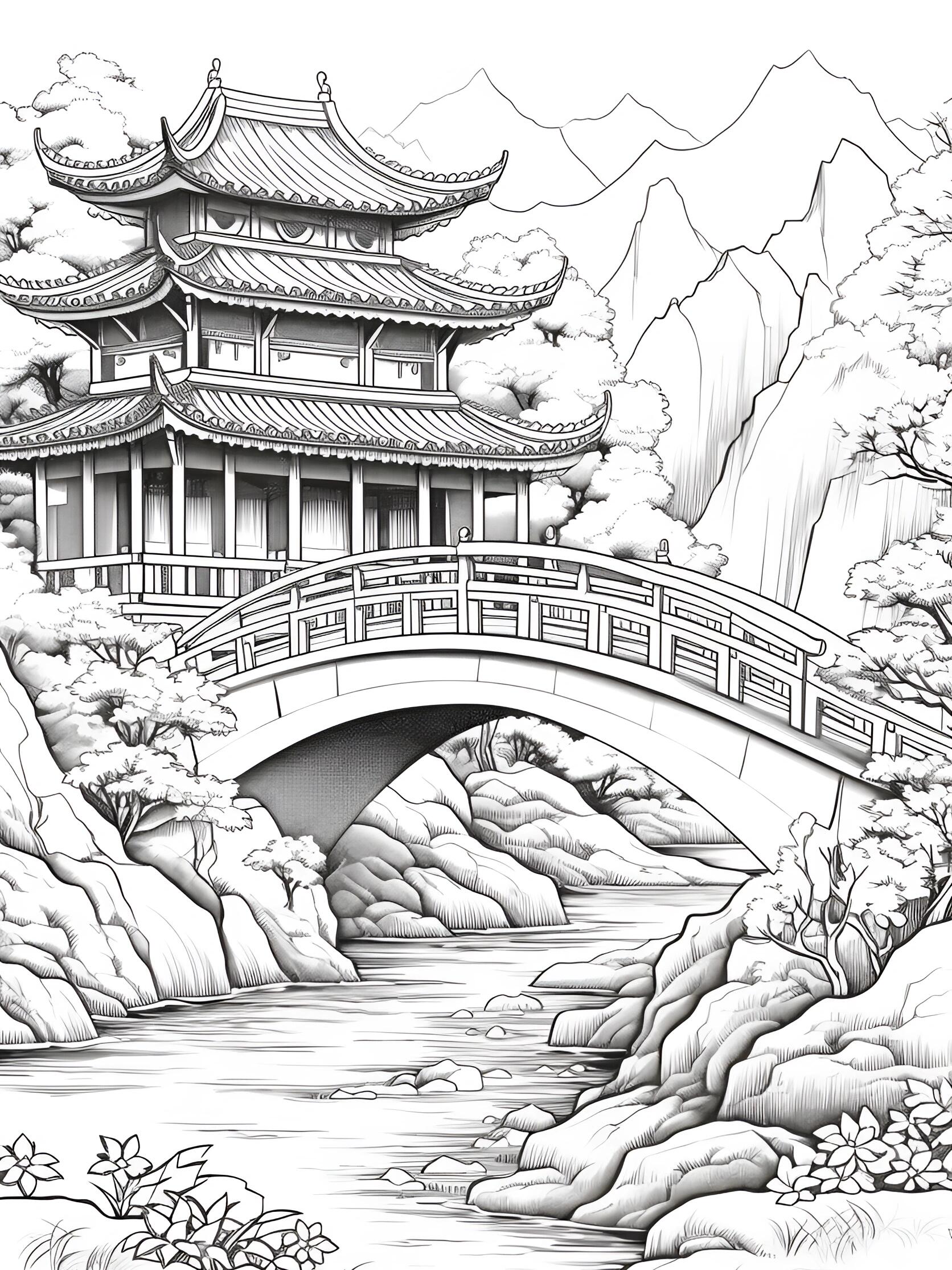 中国风高山树林古建筑黑白插画