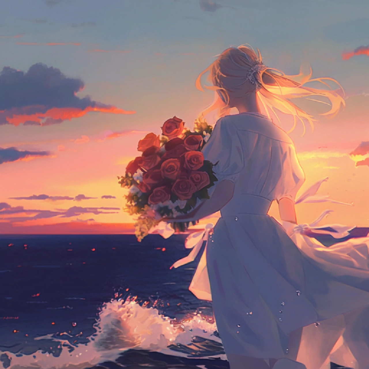 夕阳西下,海风轻拂,她手捧一束粉郁金香,静享这宁静时刻