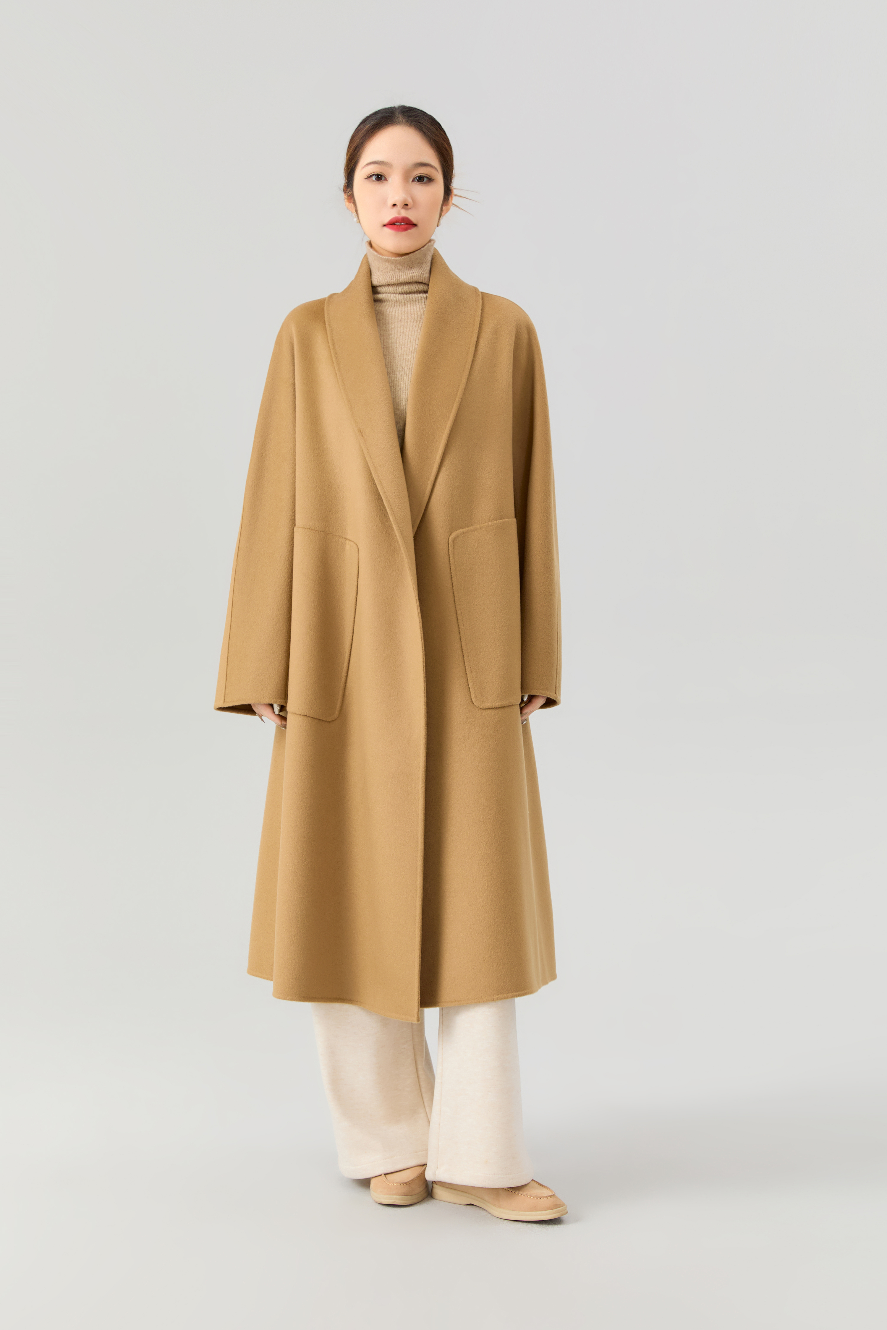 驼色双面山羊绒大衣女中长款西装领气质时尚高端毛呢外套系带显瘦