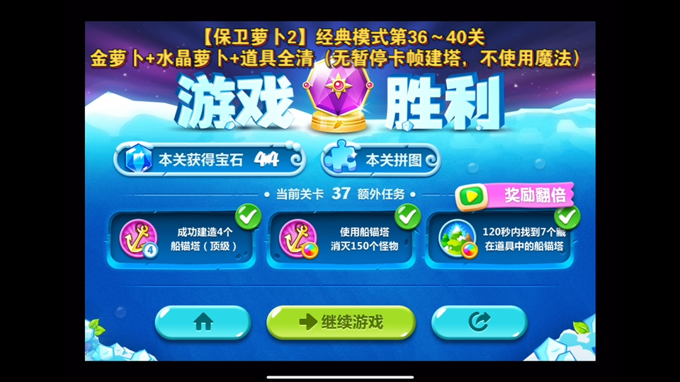 保卫萝卜2 不用道具 金萝卜 水晶萝卜 地图全清 冰川 关卡39 两次过