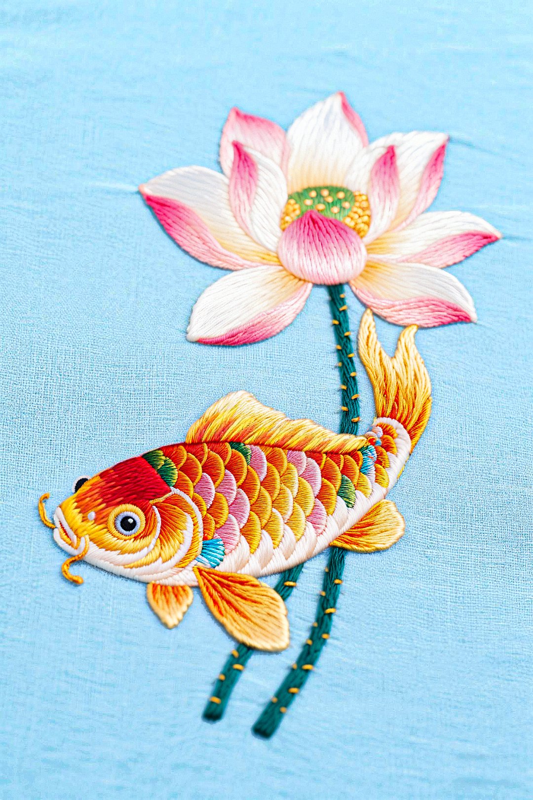 手工绣.一针一线,勾勒出灵动金鱼.红鳞闪烁,似在水中畅游;莲