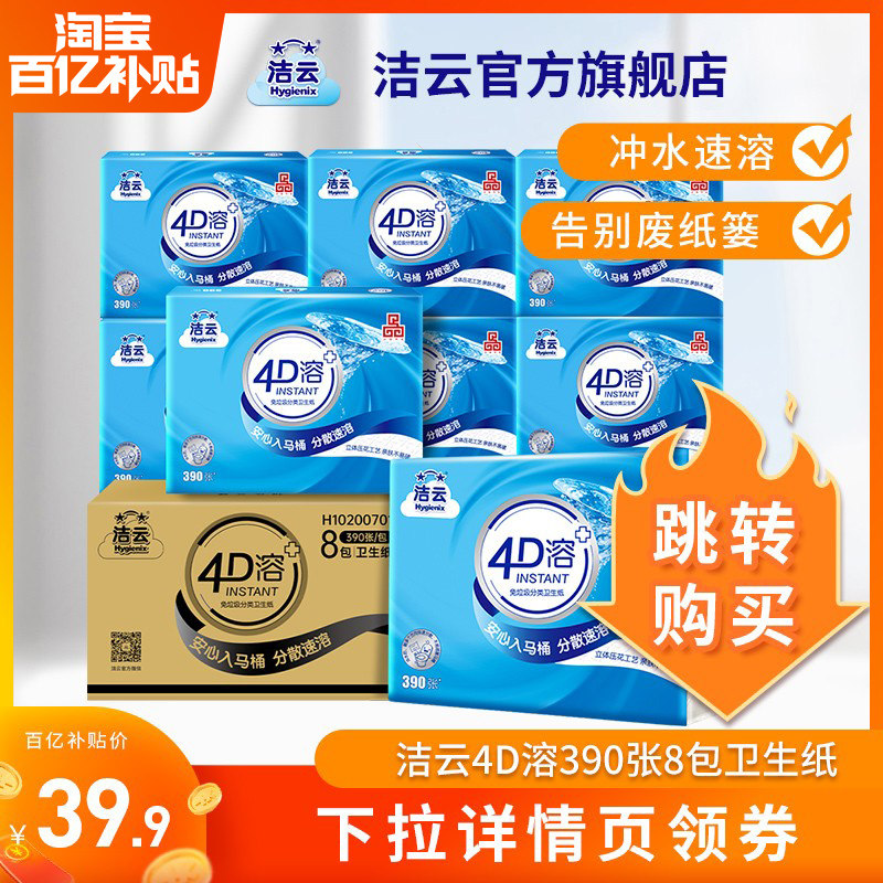 洁云4d溶390张平板纸8包方包卫生纸直冲厕纸免垃圾分类家用擦手纸
