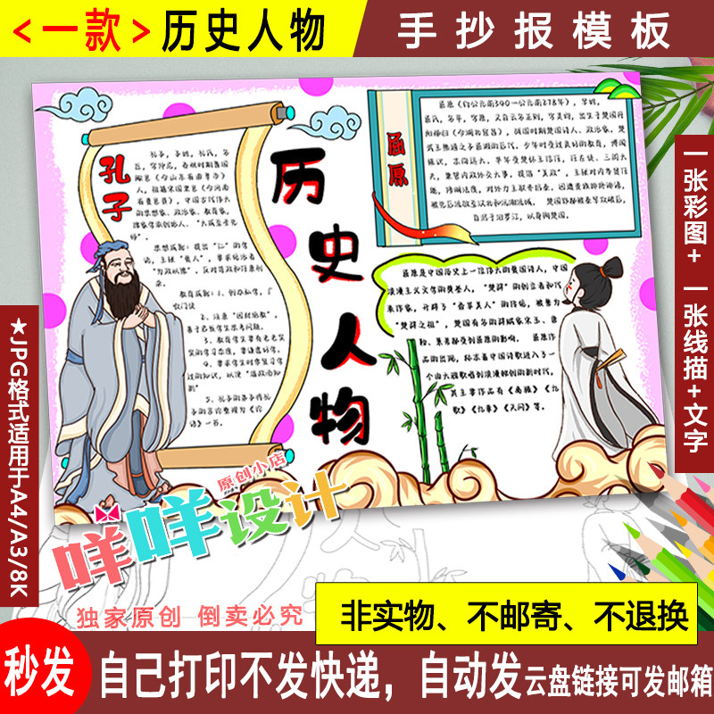七上主要历史人物介绍手抄报黑白线描涂色空白孔子屈原爱国人模板
