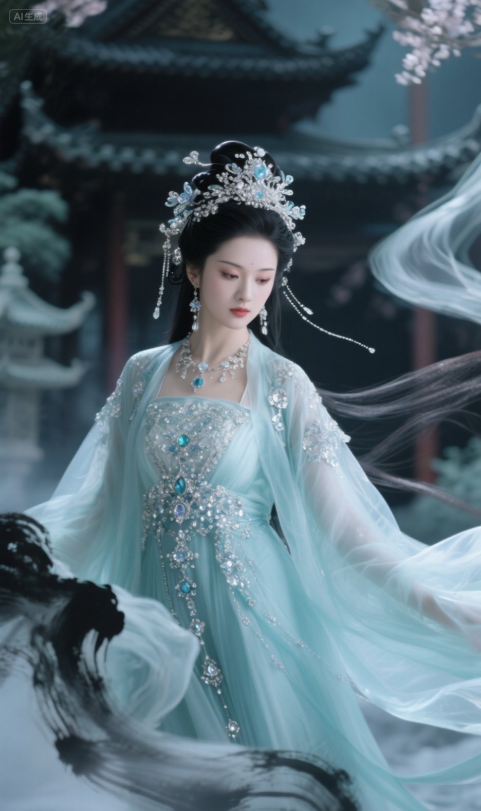 女子身着古典服饰,青色轻纱飘逸,金饰点缀其间,尽显华贵