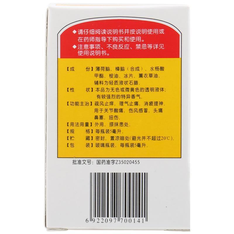 太平 白花油 5ml*1瓶/盒 疏风止痒理气止痛消疲提神 用于关节酸痛伤风