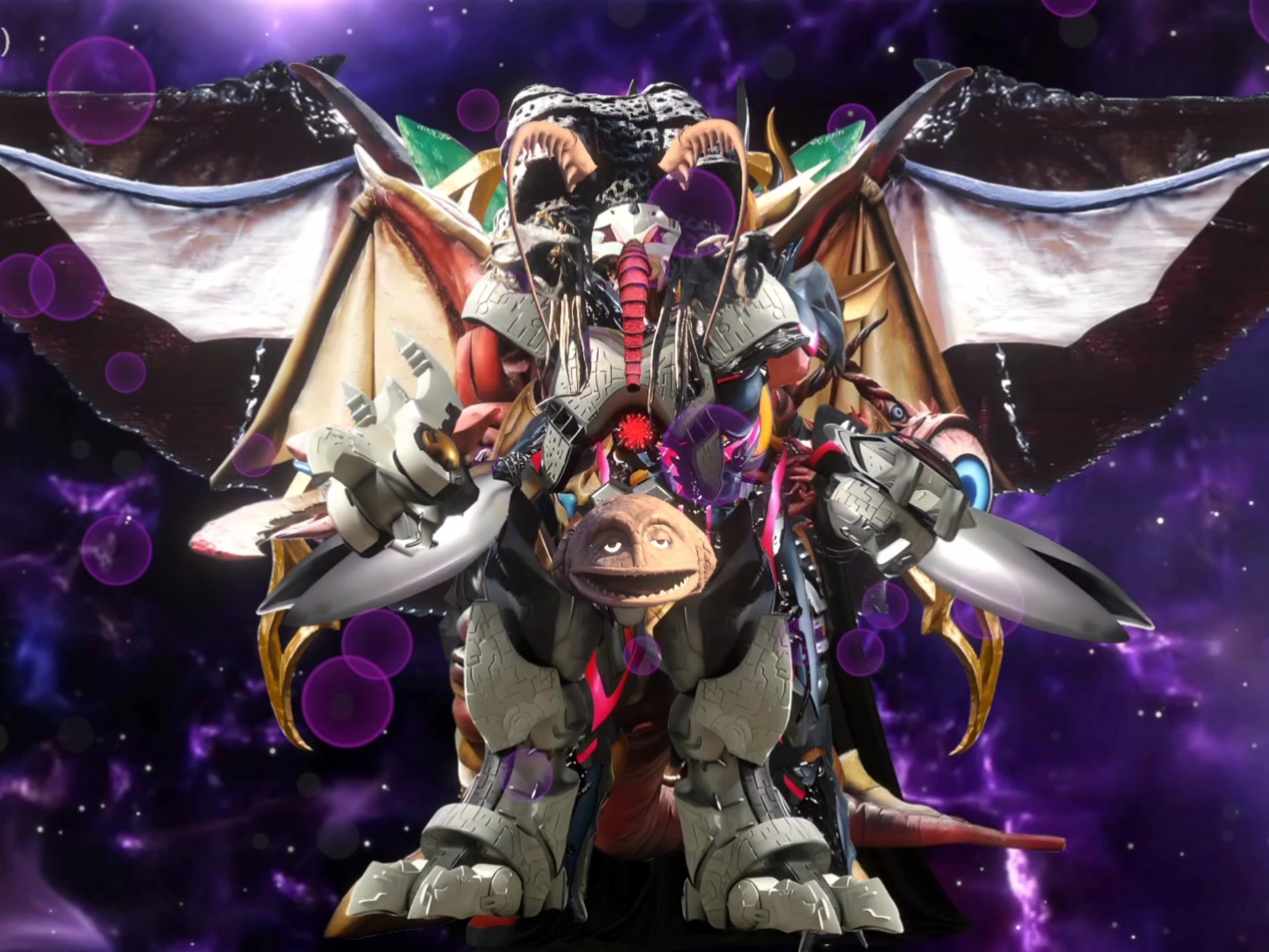 将三位奥特曼与一只怪兽融合在一起