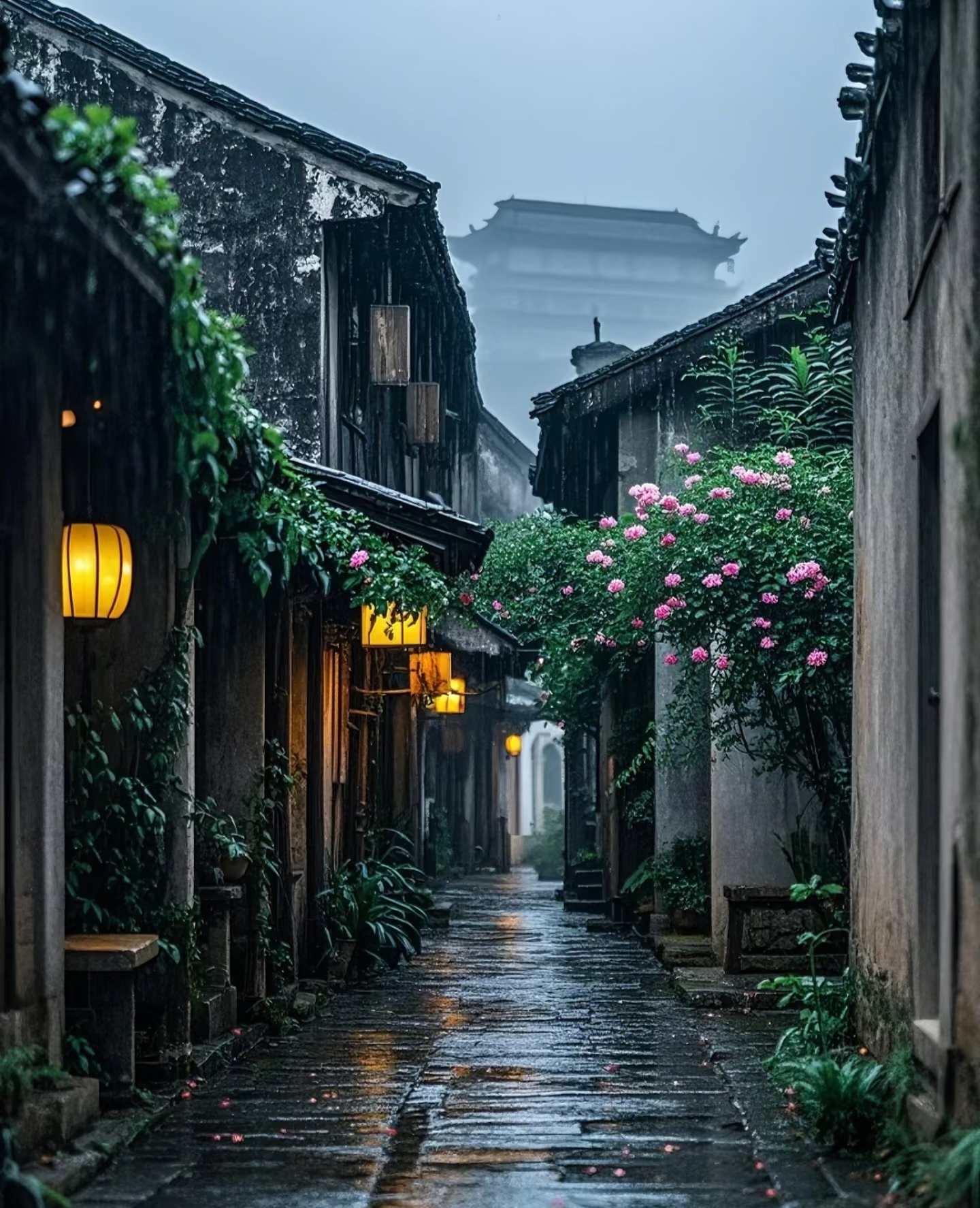 青石板巷蜿蜒入墨色深处,檐角灯笼晕开朦胧暖光,晚风掠过黛瓦,花枝轻