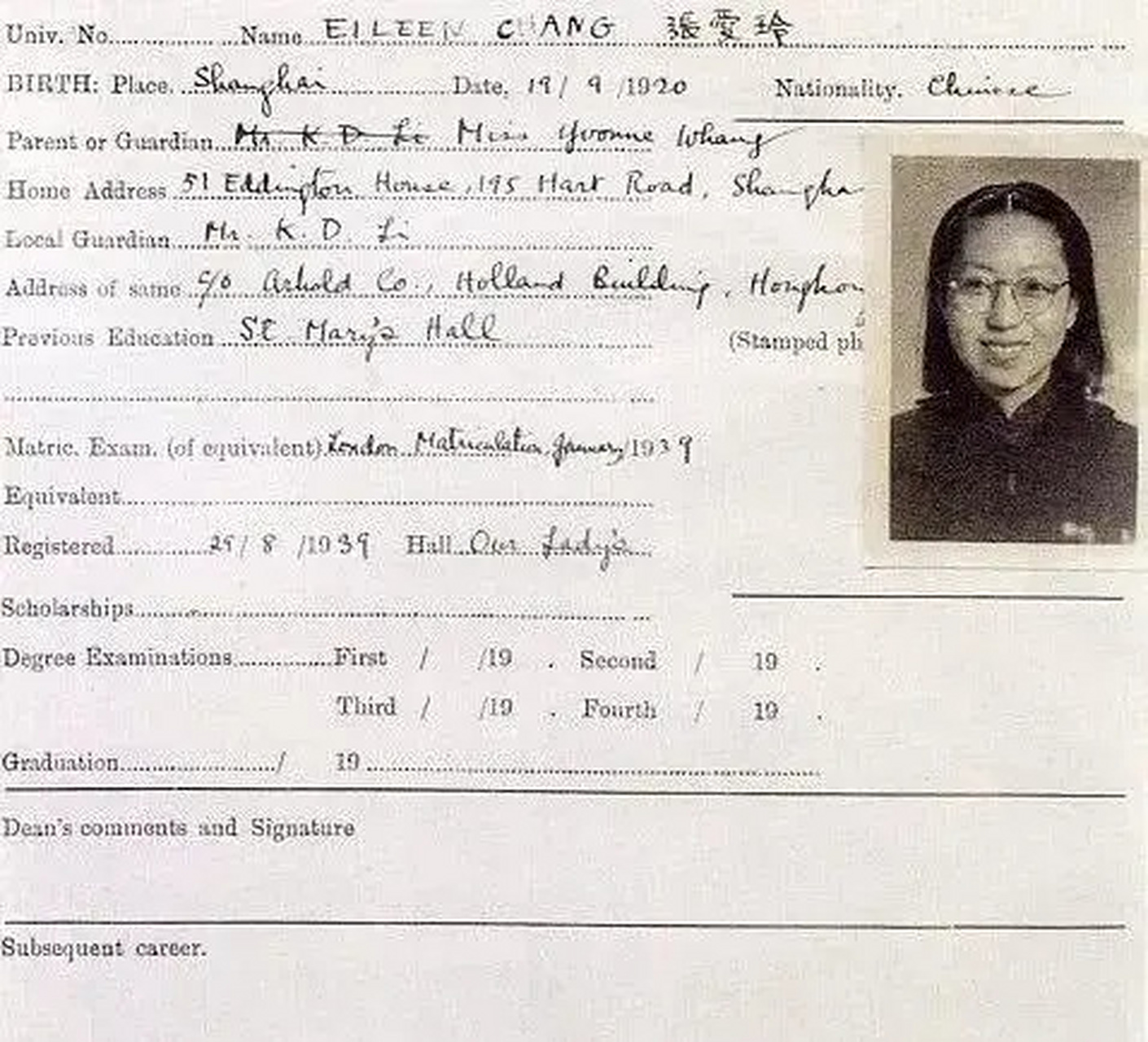 1939年,张爱玲港大的入学照,还有成绩单,那时候的她还很青涩