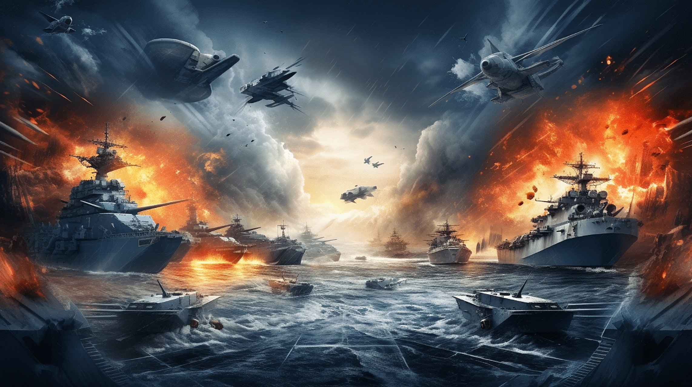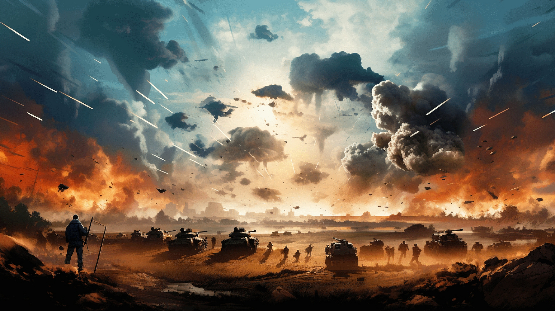ai生成的一组战斗场景绘画,画面中充满了爆炸的火光