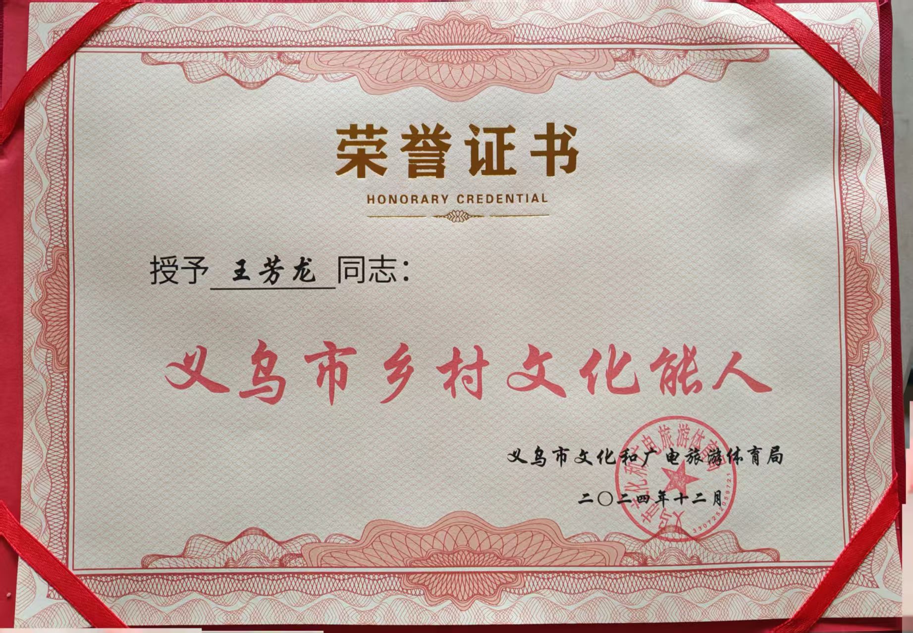 非物质文化遗产创新人才发展论坛授予的荣誉证书