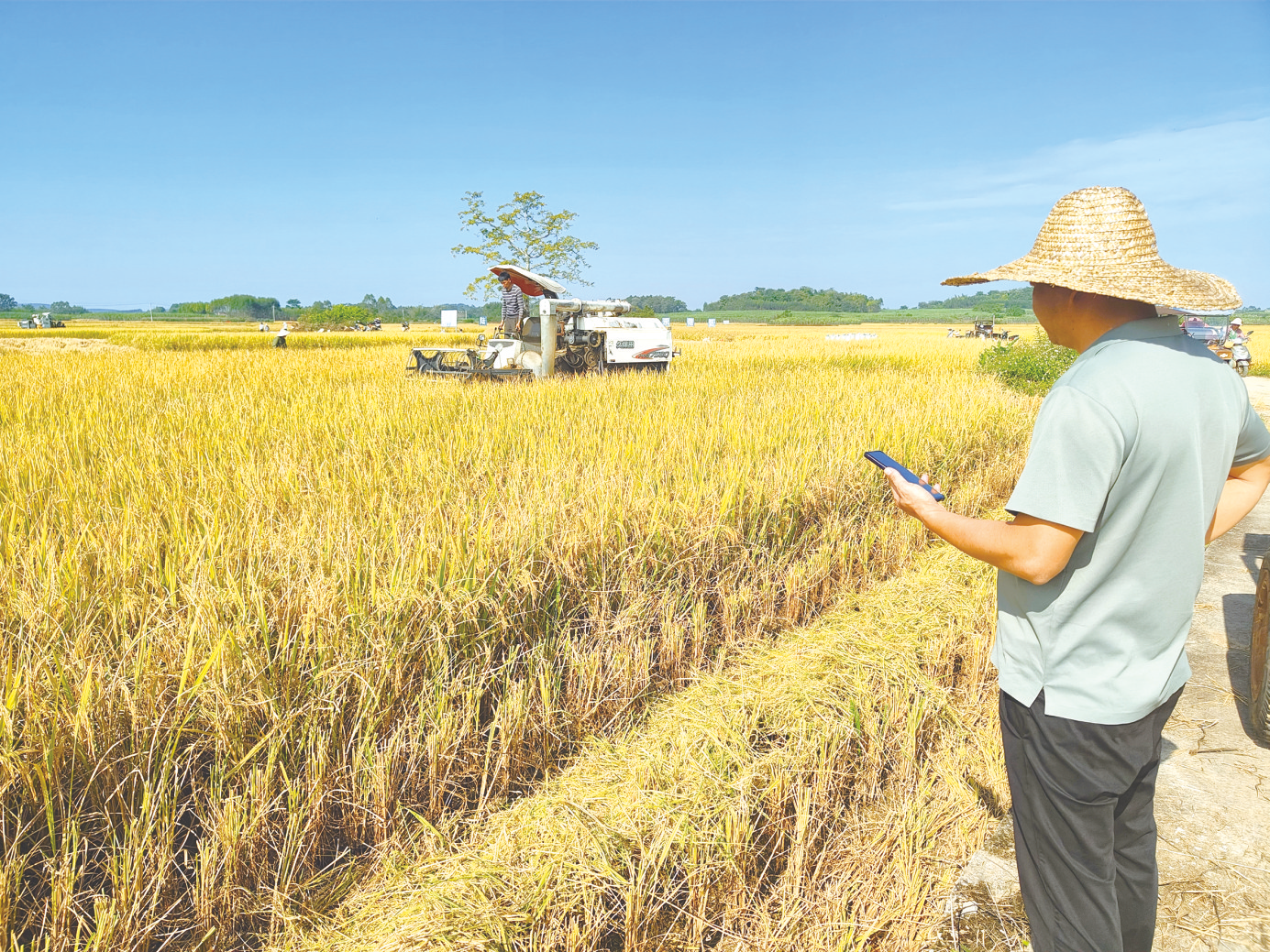 农技人员驾驶收割机收割水稻.现场购买稻谷的群众