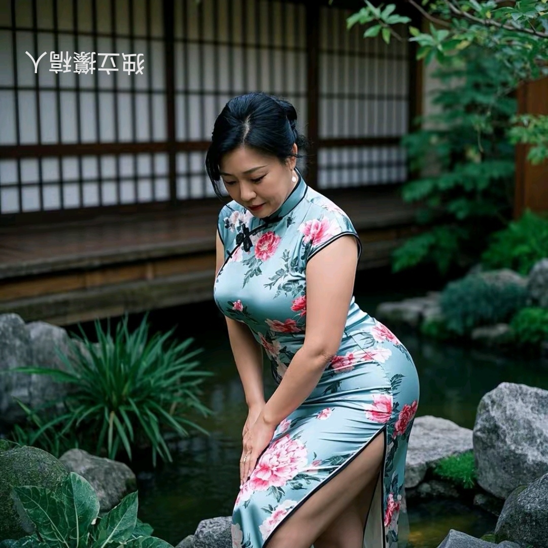 一位少妇身着典雅的旗袍,轻移莲步