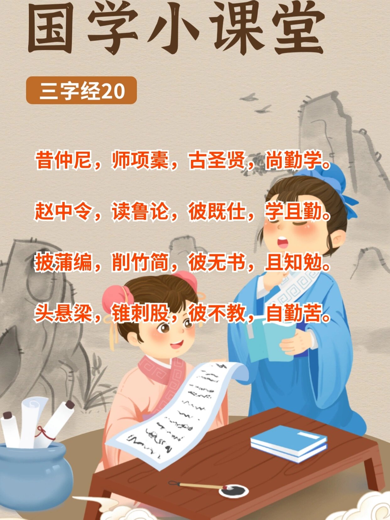 昔仲尼,师项橐.古圣贤,尚勤学.赵中令,读鲁论.彼既仕,学且勤