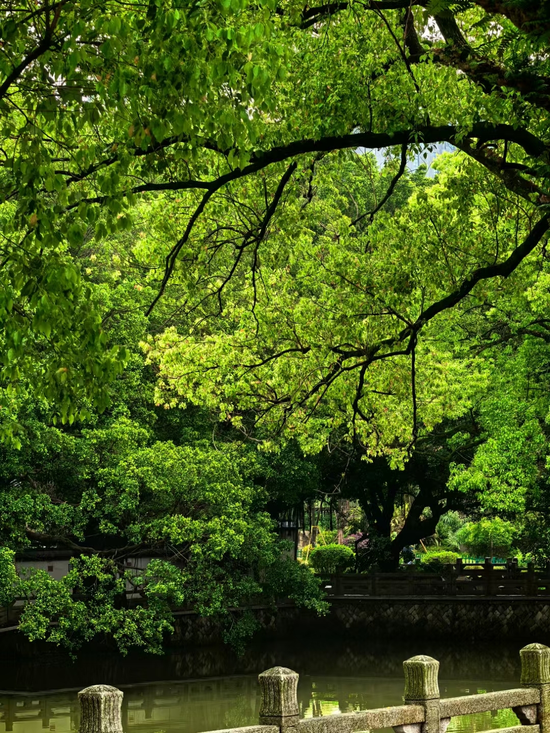 春天,公园的一角满是生机.巨大的榕树撑开如绿伞般的树冠,叶片