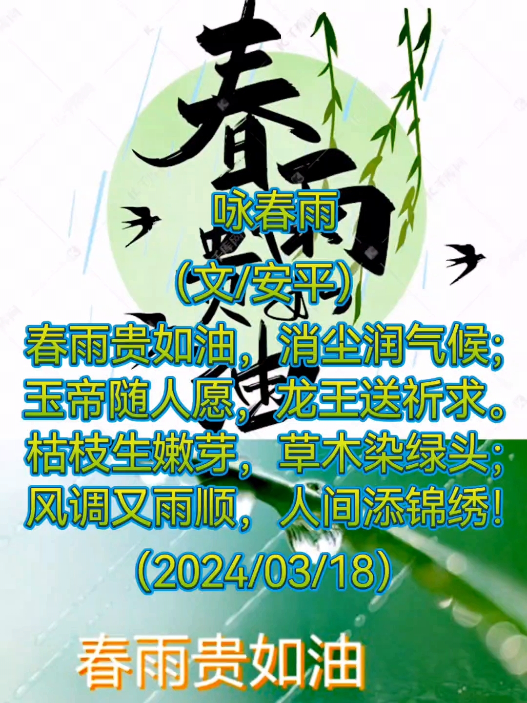 春雨贵如油,润物细无声. 雨水至,春意浓.东风拂面,温润而暖