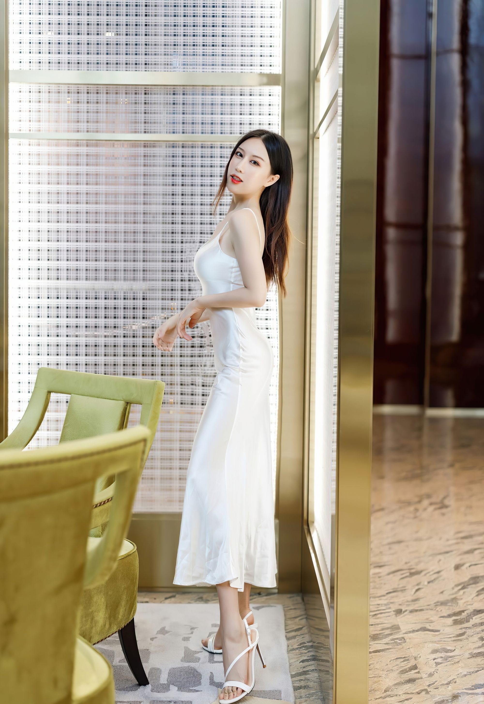 小姐姐拥有白皙肌肤的月音瞳搭配一袭白色吊带修身连衣裙,如天仙般