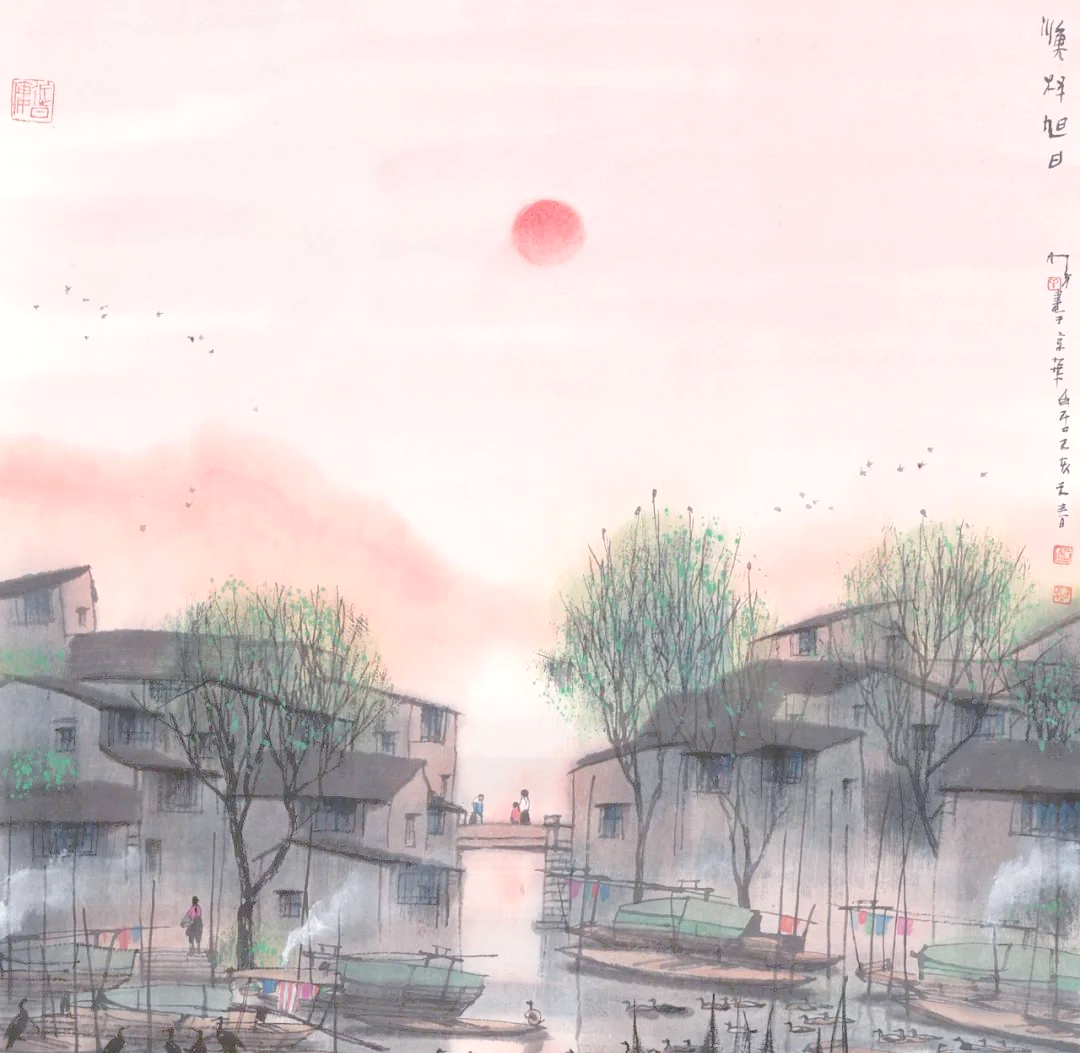 杨明义的山水画以江南水乡风光为主,笔墨淋漓,格调清新典雅,富有浓郁