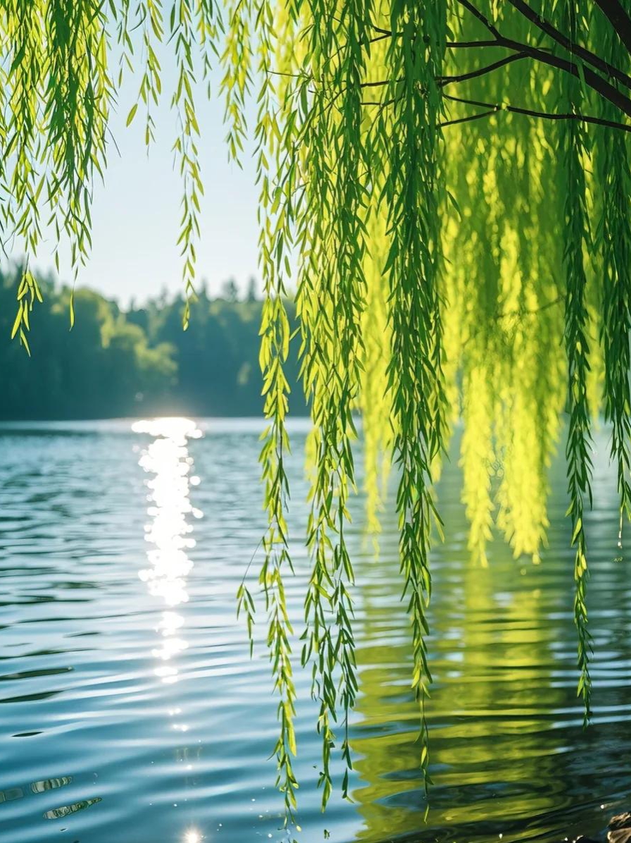 金色的阳光轻柔地倾泻在低垂的柳丝上,嫩绿的枝叶泛