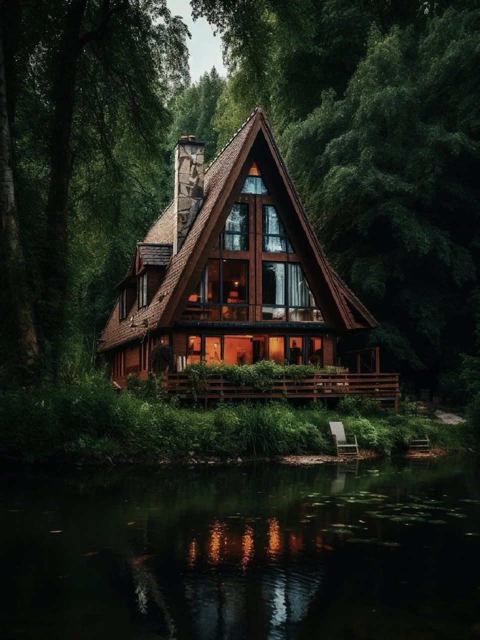 水边树林中的木头房子