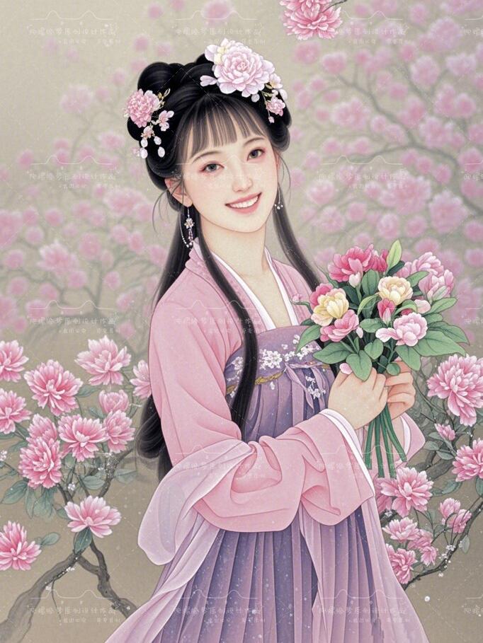 桃花飘飞工笔画,古风美人数千年