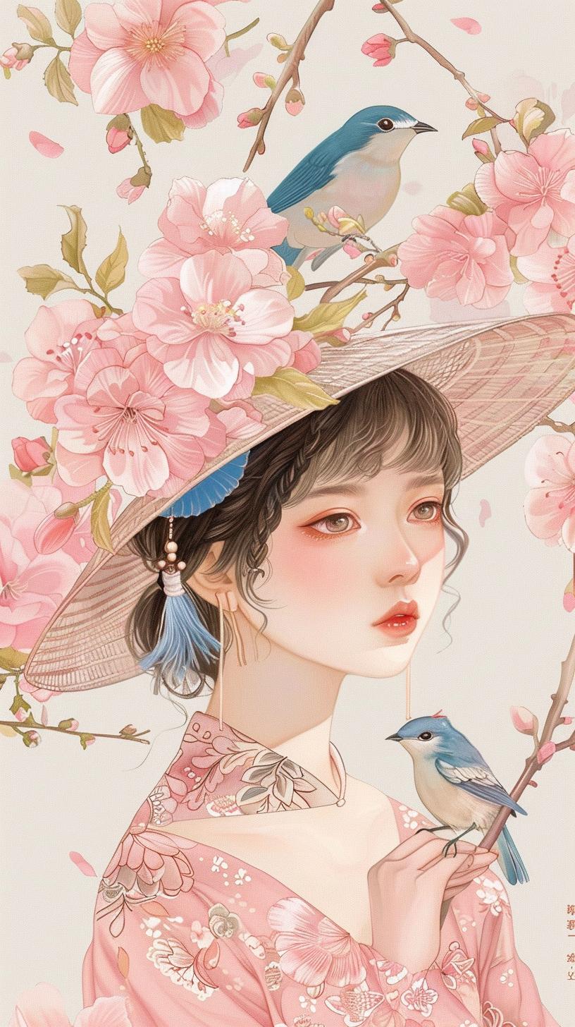 唯美浪漫粉色女神樱花节手绘插画