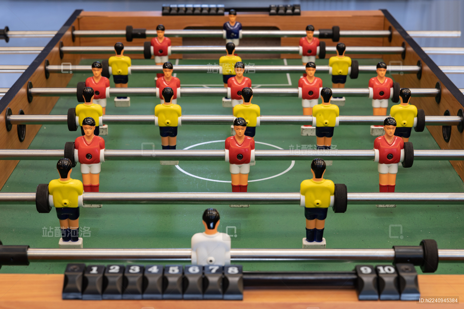 桌上足球,亦称为桌面足球,蓝色,黄色和红色的球员,在家中进行比赛