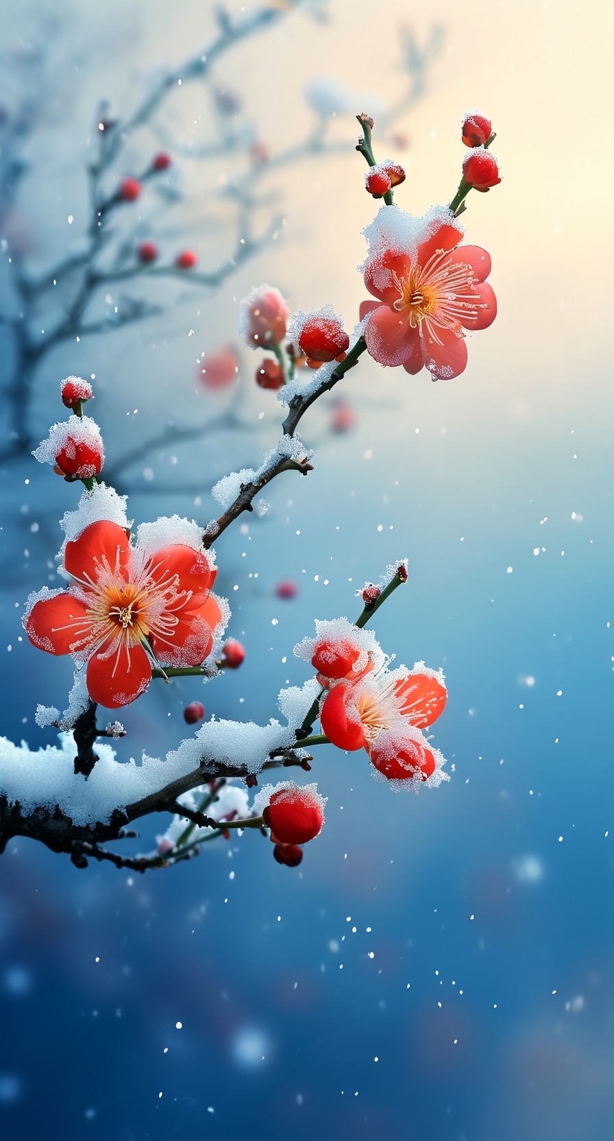 树枝上挂满了冰雪,而梅花却依然鲜艳,花瓣的颜色仿佛是冬日里的一抹