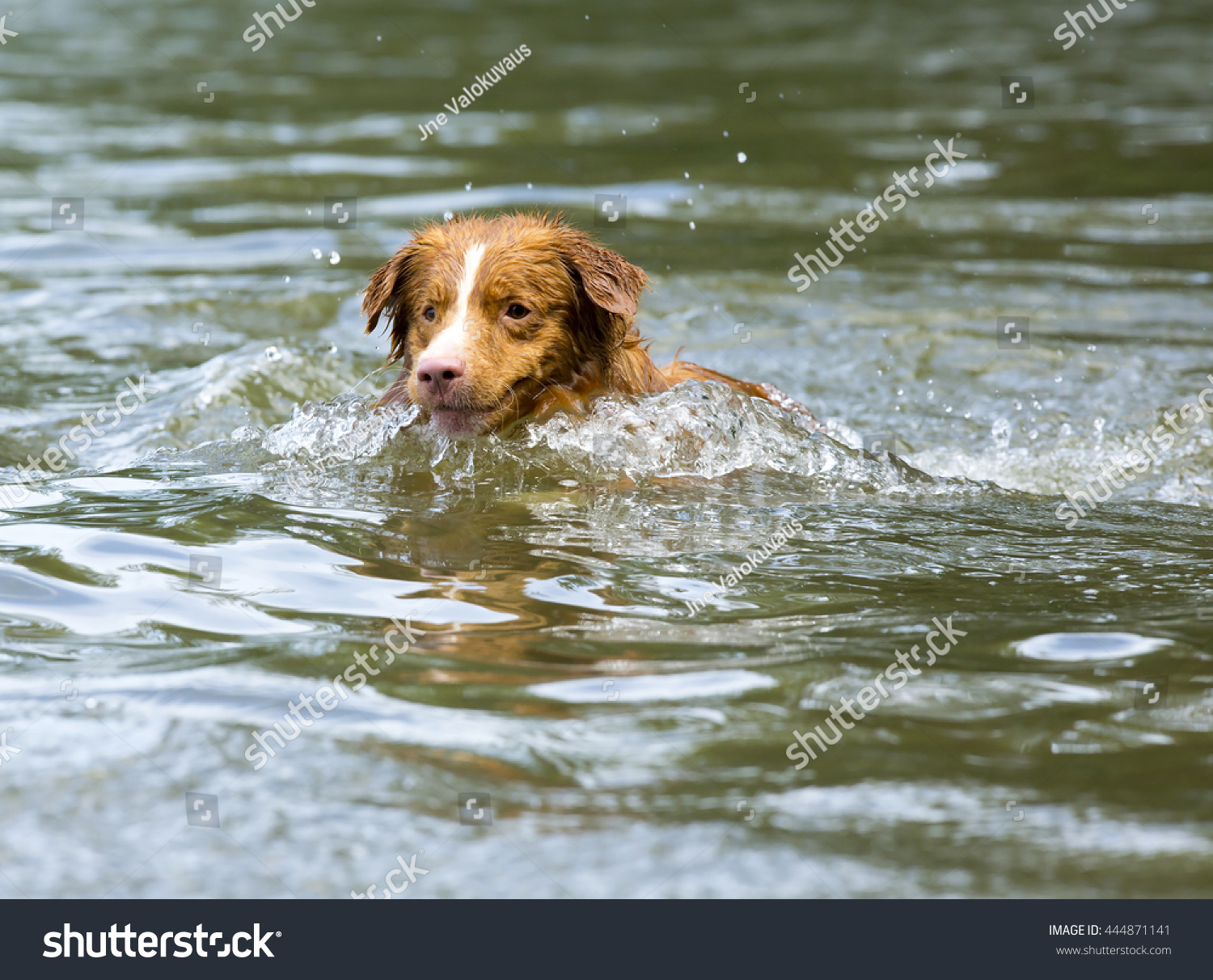 狗在河里游泳水和可见的水滴照片摄影图片