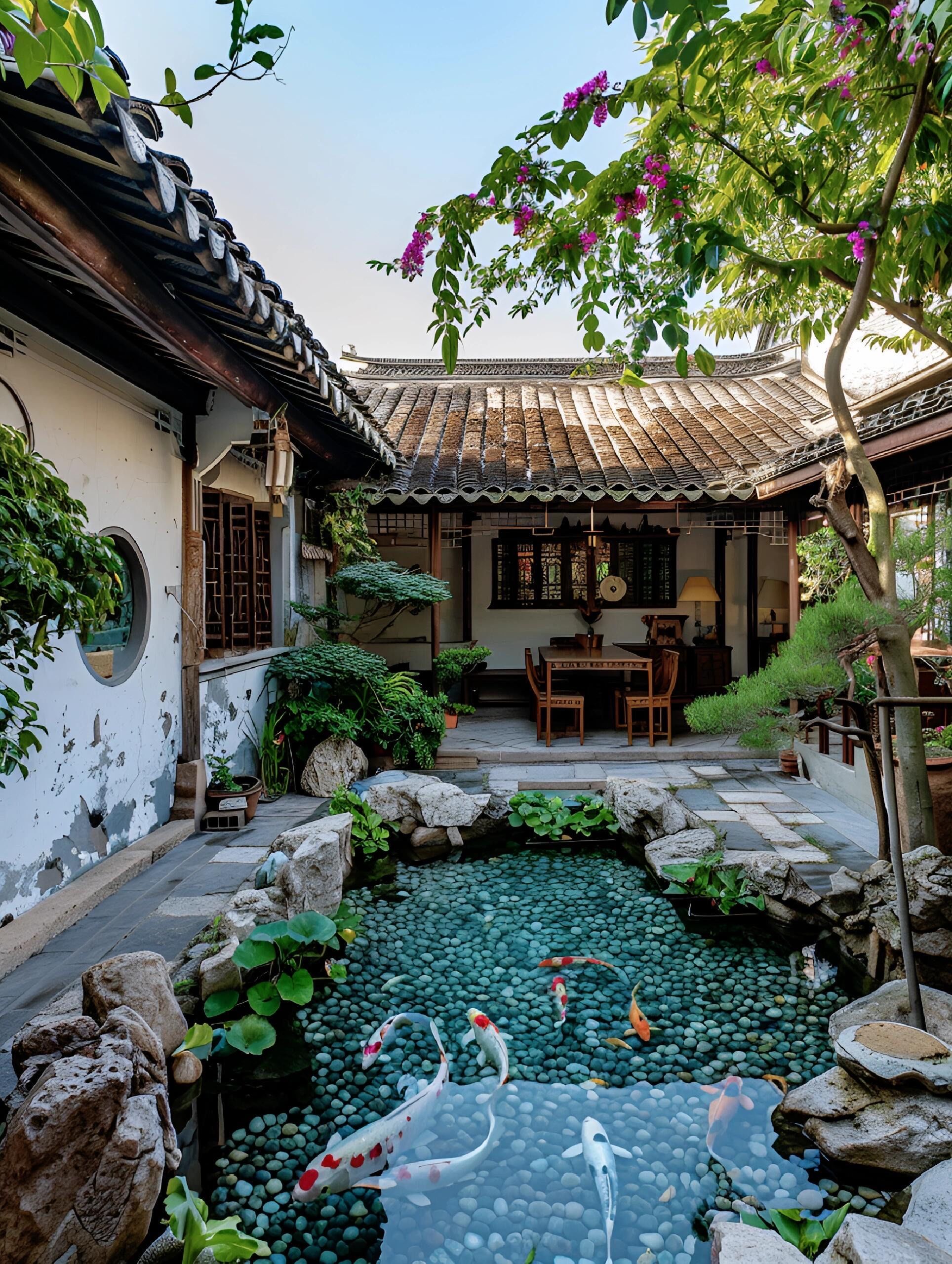 这庭院设计太美了,感觉自己置身于一个小型的江南园林中,流水,假山