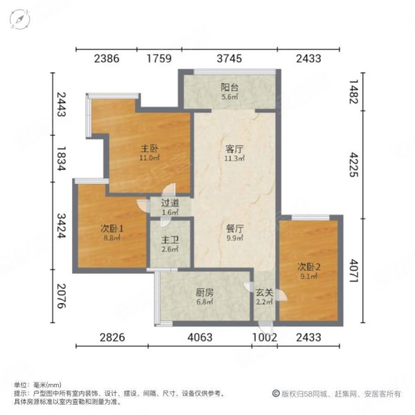 紫金江尚两室一厅一厨一卫68.58