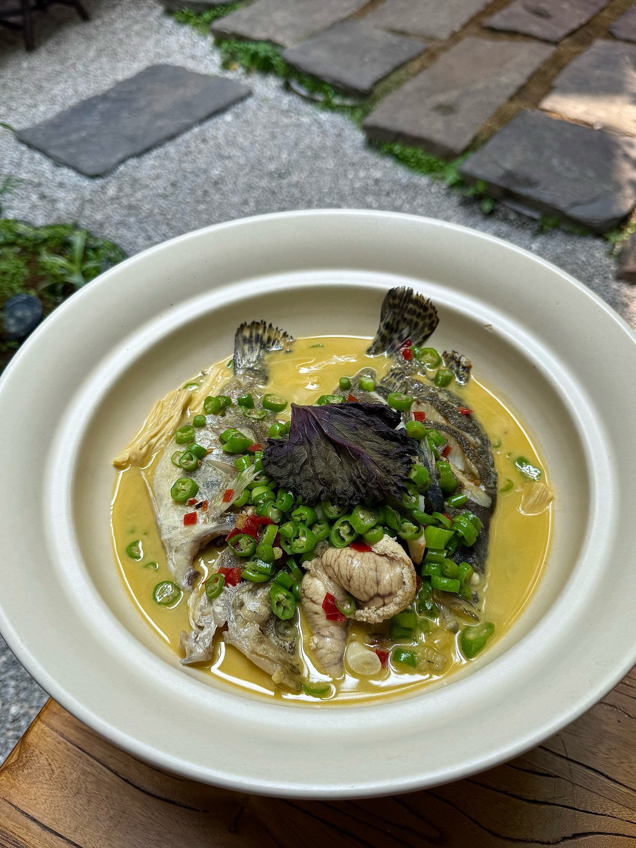 这道菜叫沉鱼落雁,大黄鱼配上熏鸭肉,好吃