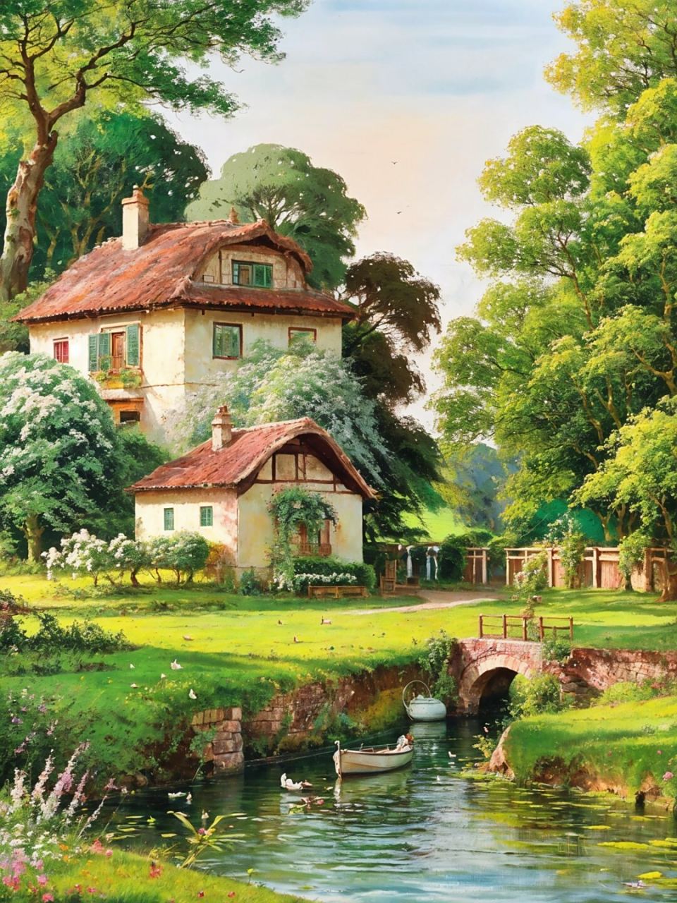 那白色小屋旁,小河轻快地流淌,河边开满了各色花草,绿树成荫,整个画面