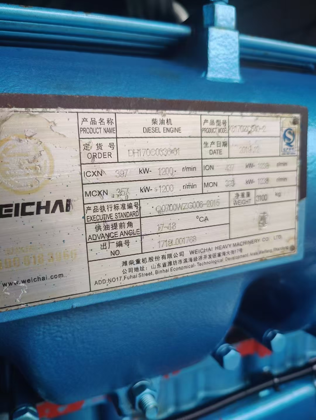 全新潍柴6170/756马力.2021年12月出厂,证书,配