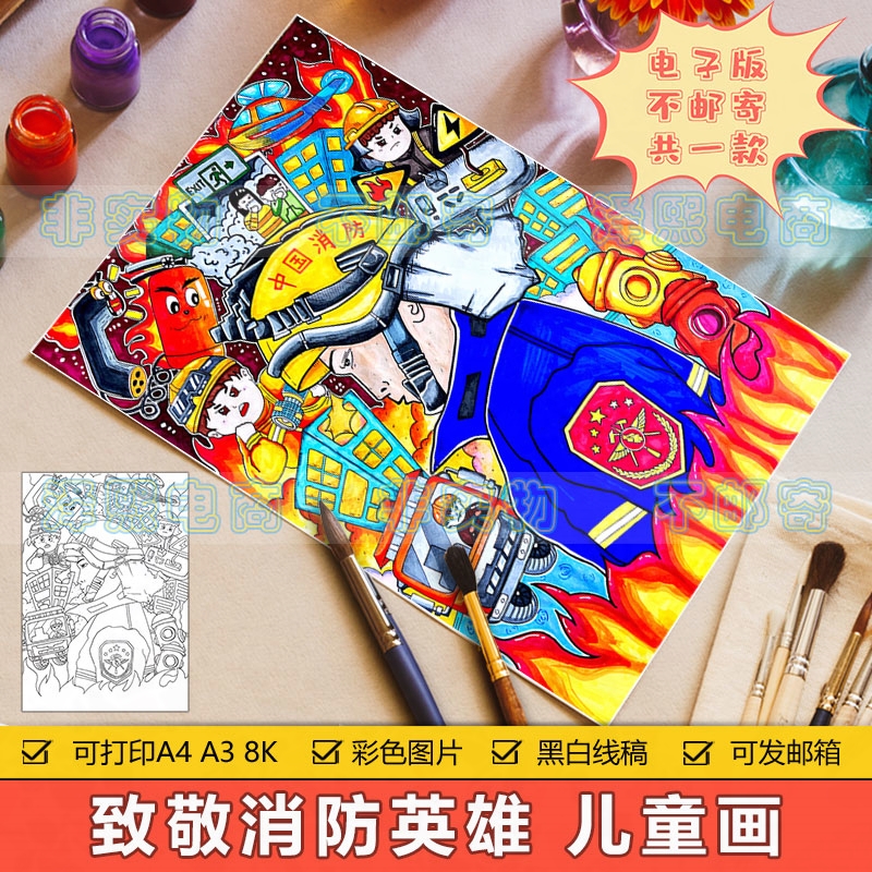 全国消防日竖版儿童画小学生致敬消防英雄预防火灾安全教育手抄报
