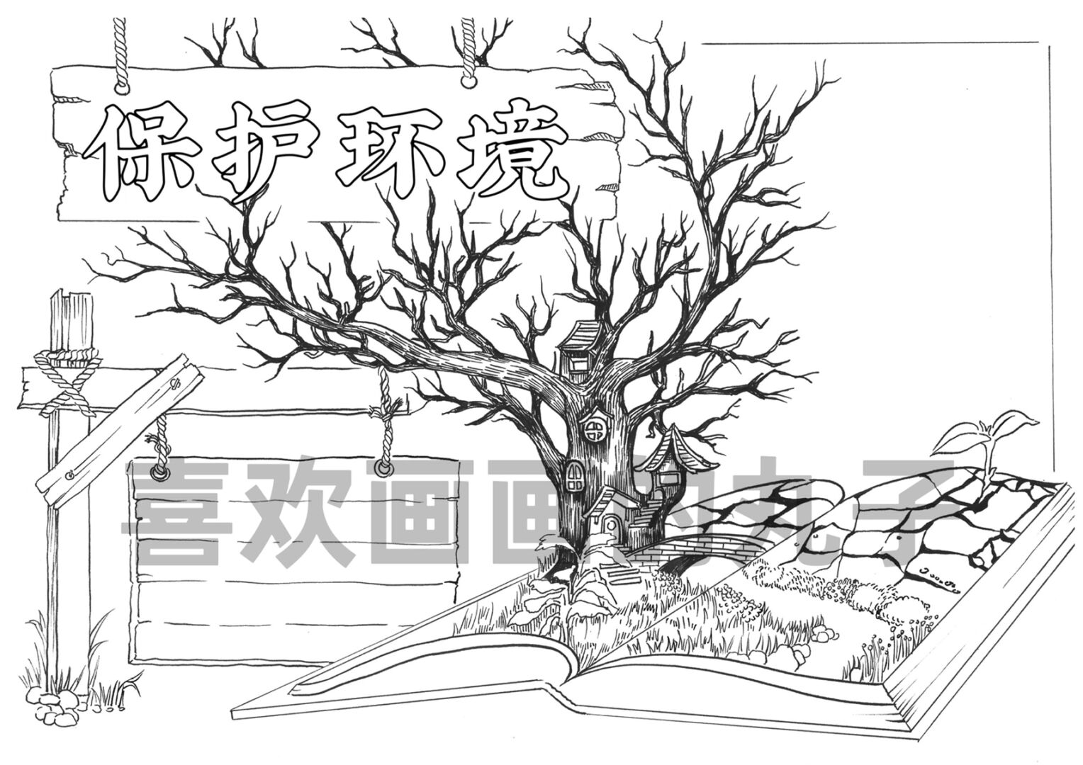 环境保护黑白画