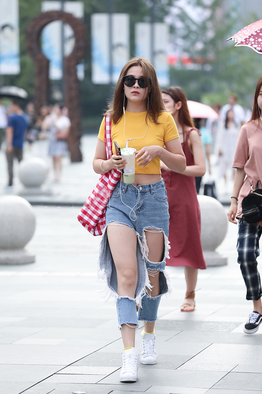 美女穿着甜美的短袖破洞裤出街