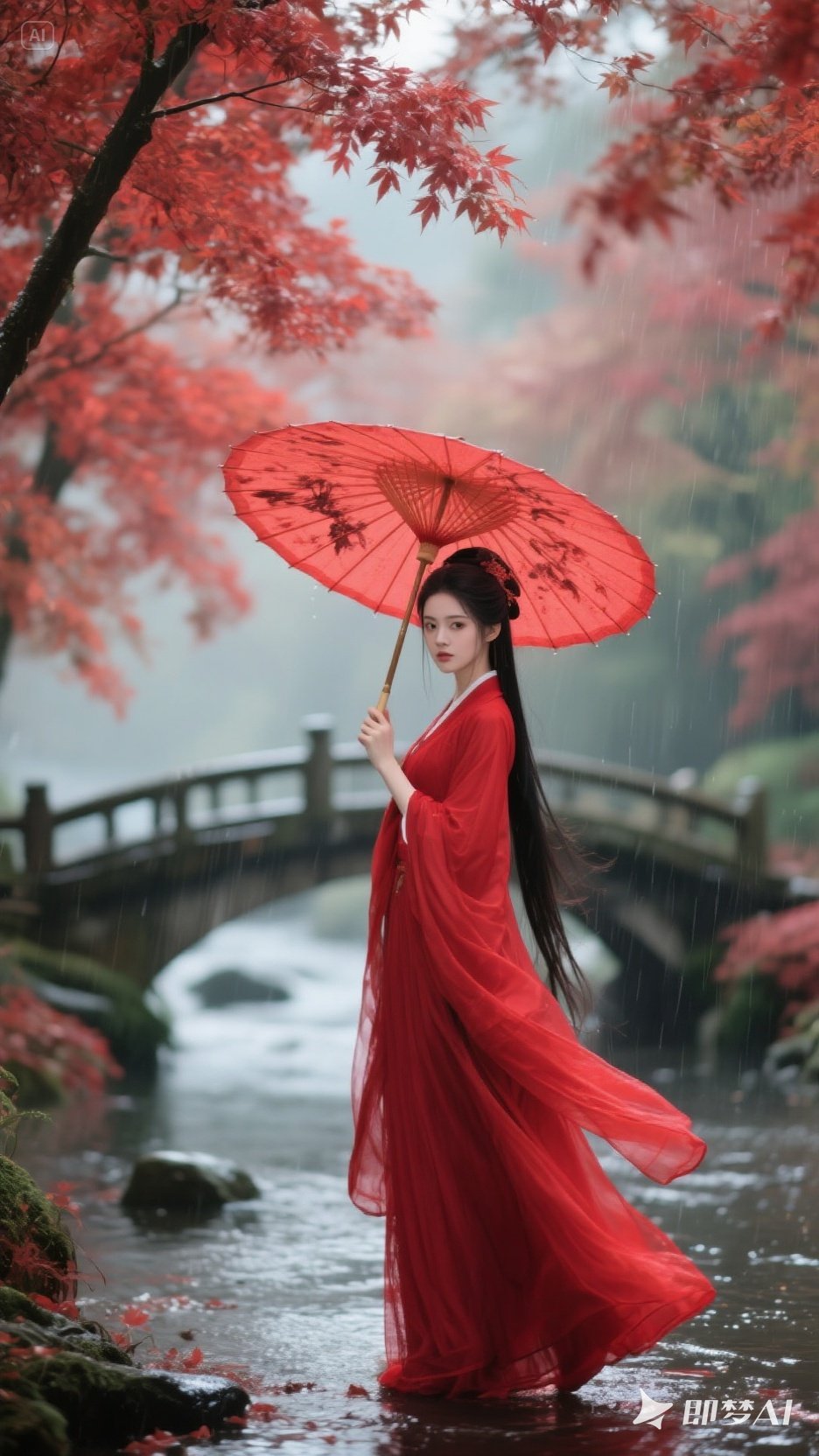 "漫步烟雨中,红衣女子执伞,翩若惊鸿