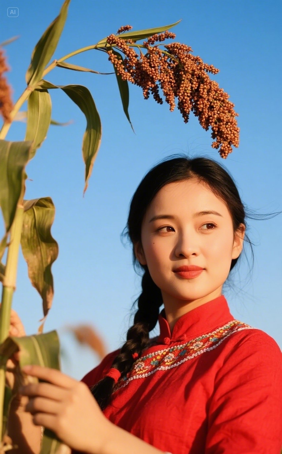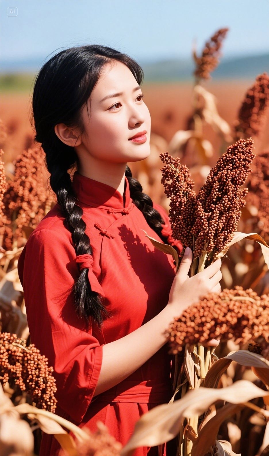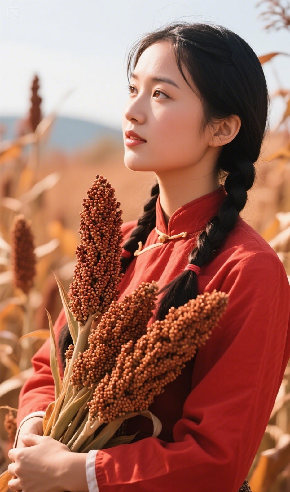 夕阳下的她,手中握着一株红高粱,静静地望着前方