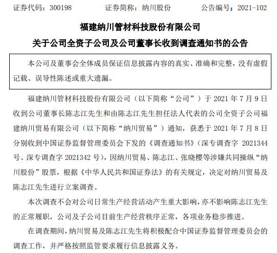 涉嫌共同操纵公司股票 纳川股份董事长陈志江被立案调查