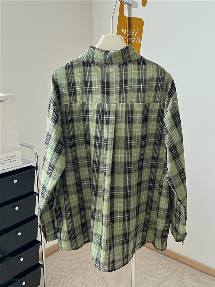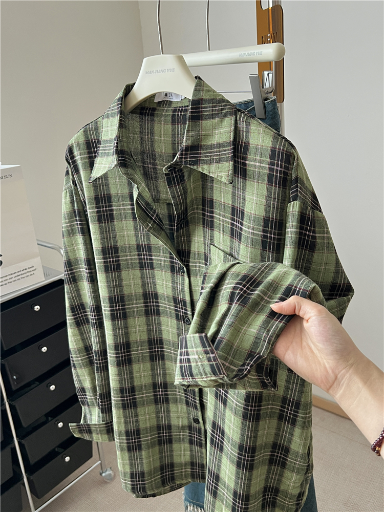 春季新款韩系慵懒风绿色格子衬衣女百搭休闲衬衫宽松显瘦长袖上衣