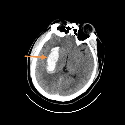 检查结果:未增强的ct显示右侧基底节高密度