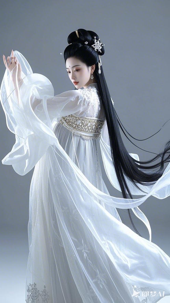 一袭浅蓝薄纱汉服,轻柔飘逸,似仙云缭绕.银白长发如瀑,随意间