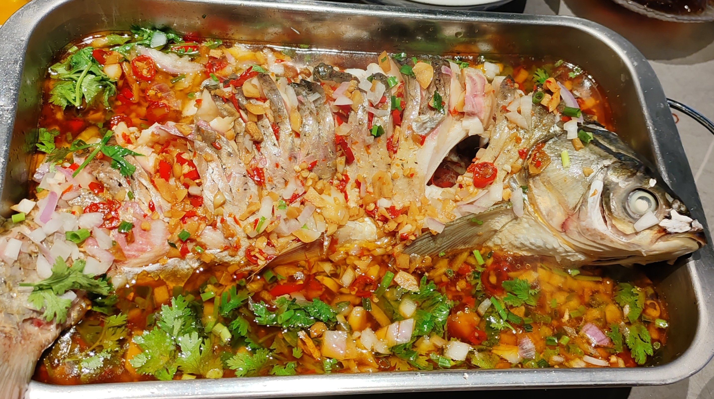 鲜椒跳水鱼用料很足,鱼肉特别嫩滑.脆炸酥肉外
