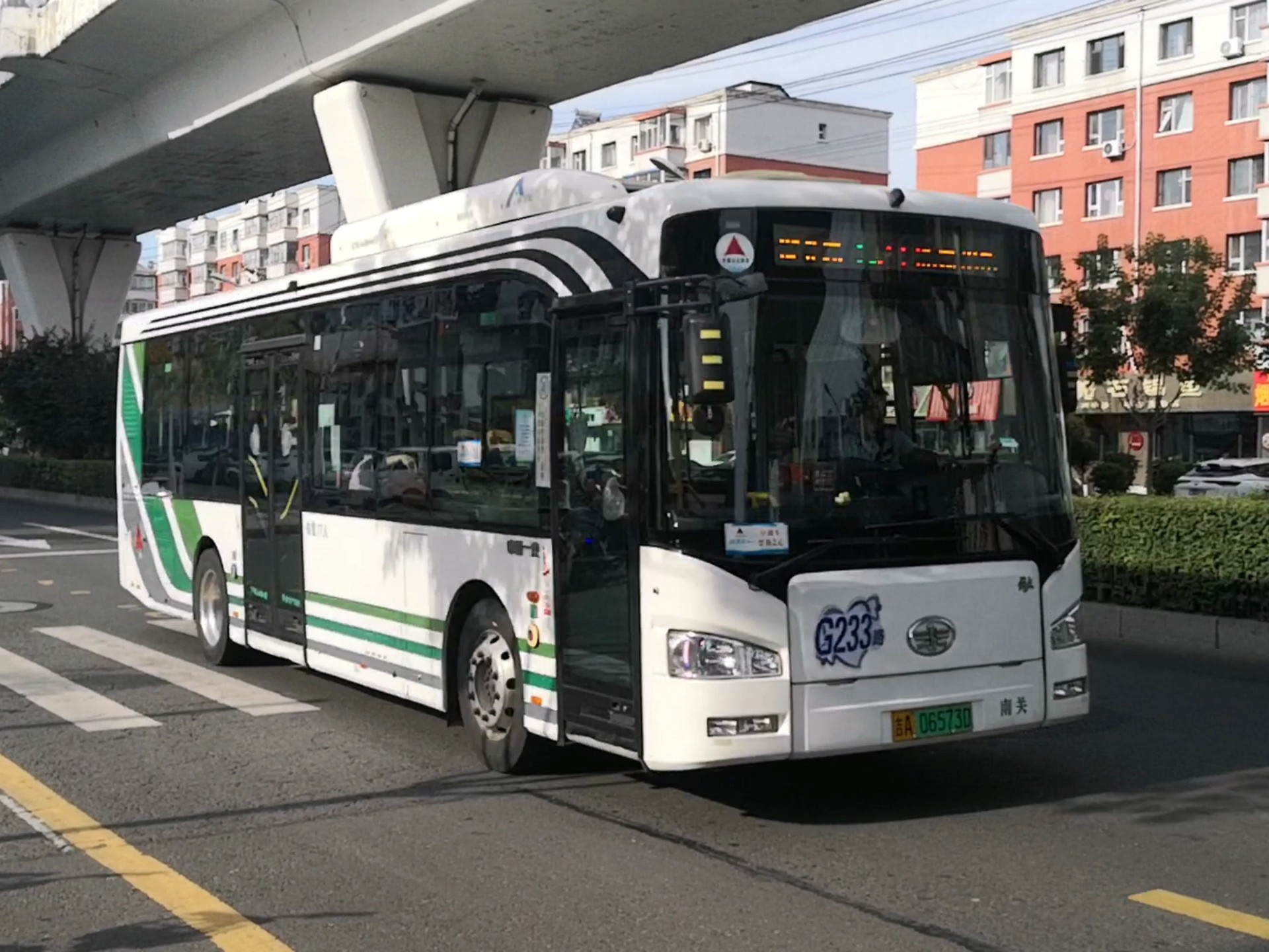 g233路一汽ca6100urbev25型纯电动公交车通过临河街
