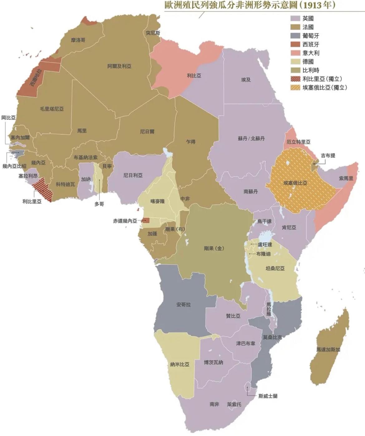 整个非洲大陆都被欧洲帝国主义列强所瓜分,其中,以英,法两国所占的