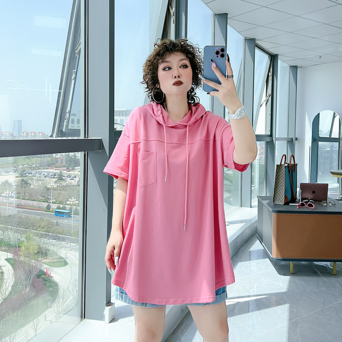 潮小众设计感后背系扣大码女装200斤胖mm纯色宽松遮肉连帽上衣t恤